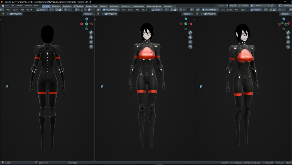 Polycount is at 65k, pretty decent number to use for animating and porting it to games like VRchat. I'm not really that good yet with rigging, so expect some weird deform. And i only add deform bone, for IK i use auto IK from blender itself. Textures is packed to the blender file and i will include the textures to the zip just in case. I added simple keyshapes such as blink and some visemes, i dunno about the visemes if is it good or no. Lastly, I use Blender 4.2.